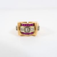 Bague Tank 2 ors 750 mil. ornée de diamants TA encadrées d’une ligne de pierres imitation rouges calibrées, épaulés de roses. (TDD : 58). 11,9 g. brut.
