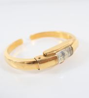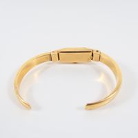 Bracelet-montre de dame BAUME & MERCIER en or 750 mil, petit boîtier rectangulaire, cadran champagne à chiffres arabes et index bâtons dorés, mouvement mécanique défectueux, bracelet jonc rigide ouvrant. (Tour de poignet : 14 cm environ) (Mouvement cassé, importantes usures au cadran, chocs, système ressort à revoir, en l'état). 14,9 g. brut.