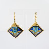 MICHAELA FREY Paire de boucles d'oreilles de forme losangique en métal doré émaillé polychrome à décor de croix Ankh. Signées. (Dimensions hors bélières : 4 x 3,5 cm environ).