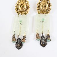 Paire de pendants d'oreilles en or 750 mil. ciselé retenant une plaque rectangulaire de jade gravé, à trois pampilles, l'une en or 750 mil. noirci serti de roses, les 2 autres en argent 800 mil. rehaussées d'aventurine verte (fils en métal doré), systèmes poussettes. (Hauteur : 7,5 cm environ) (Largeur : 2 cm environ). 21,8 g. brut.