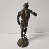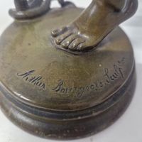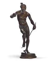 Charles-Arthur BOURGEOIS (1838-1886) Le charmeur de serpent Bronze à patine verte Signé « Arthur Bourgeois Sculpteur ». H. 33 cm. (Raccord du bras gauche légèrement mobile, flûte et bâton légèrement déformés) Estimation : 400 / 600 € Œuvres en rapport : -Charles-Arthur Bourgeois, Le Charmeur de serpent, 1862, bronze, H. 200 cm, Paris, Jardin des Plantes ; -Charles-Arthur Bourgeois, Le Charmeur de serpent, plâtre patiné, H. 180 cm, Poitiers, musée Sainte-Croix, inv. SECT 241. Littérature en rapport : -Stéphane Richemond, Les Orientalistes, Dictionnaire des sculpteurs, XIXème-XXème siècles, Paris, Les Éditions de l’Amateur, 2008, modèle illustré p. 56. Élève de Duret et de Guillaume à l'École nationale des Beaux-Arts, il obtient le grand Prix de Rome en 1863 avec son Nisus et Euryale. Il participe à tous les salons entre 1863 et 1886 et reçoit régulièrement des médailles. Alors que le modèle en plâtre de son œuvre Un charmeur de serpent est exposé au Salon de 1863 (n°?2516), le ministre de la Maison de l'empereur et des Beaux-Arts lui commande la même année une version en bronze pour le Jardin des Plantes. Des réductions sont réalisées par la fonderie du fabricant de bronzes d'art Louis Léon Marchand (1831-1899).
