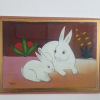 Gora M'BENGUE (1931-1988) "Lapine et lapereau" Peinture fixée sous verre signé en bas à gauche. 24 x 33 cm. (Une fêlure et un éclat du verre dans le coin supérieur gauche)