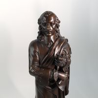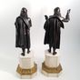 Ecole française du XIXe siècle Molière et Corneille Deux statues en bronze à patine brune en pendants sur socle octogonaux en onyx et marbre chacun rehaussé d'une frise de métal doré à motif d'enroulements, de fleurettes et feuillages soulignés filets rubanés. Hauteur sans socles : 37 et 37,5 cm ; Hauteurs avec socles : 57 cm. Accidents aux socles.
