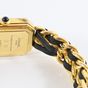 "CHANEL. Bracelet montre «Première».Boîtier octogonal (26 x 20mm environ) en métal doré, cadran noir sans index, mouvement à quartz, fond clippé. Bracelet double rangs de chaîne en métal doré entrelacées de cuir noir. Signée et numérotée. Année de création du modèle 1987. Tour de poignet 16,5cm environ. Taille M. Sans écrin, ni papiers. (Légère oxydation sur les aiguilles, rayures, salissures, lanière en cuir noir défectueuse). (Fond à reclipper). Sans écrin, ni papiers. "