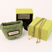 GUCCI. Collier "Interlocking" en métal doré retenant un pendentif orné des 2 G entrelaçés strassés et d'une perle imitation. Longueur 55 ou 61cm. Bon état. Dustbag, Boîte Gucci.