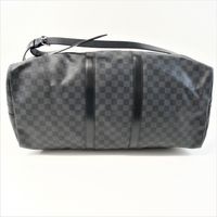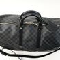 LOUIS VUITTON. Sac de voyage "Keepall" année 2018, 55cm en toile Damier graphite et cuir noir, fermeture éclair à double curseur, double poignées, anse bandoulière amovible réglable, porte-nom, cadenas et 2 clés. Garniture en métal argenté. Bon état général (quelques taches intérieur et extérieur). Numéroté. Ht.31 x Larg.55 x P.26cm environ. Dustbag et facture.