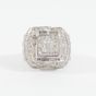 Bague chevalière en or rhodié 585 mil centrée d'un pavage de diamants princesse en serti illusion, entouré et épaulé de diamants baguettes et ronds brillantés (TDD : 50) (Dans son écrin et sa surboîte). 16,5 g brut.