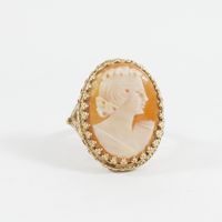 Bague en or 375 mil centrée d'un camée coquille figurant un profil féminin (Dim : 1,7 x 2,1 cm environ) (TDD : 54,5). 4,7 g brut.
