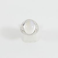 Bague jonc en or rhodié 750 mil centrée d'un cabochon de pierre de lune (égrisures) épaulée de diamants en serti clos (TDD : 56). 11,9 g brut.