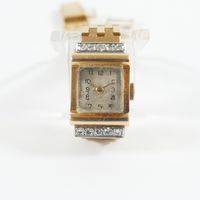 Bracelet-montre de dame en or 750 mil, boîtier rectangulaire à rouleaux et attaches ornées d'une ligne de diamants 8/8 (Dim avec attaches : 2,3 x 1,4 cm environ), cadran taché beige à chiffres arabe, tour de bras souple à maillons briquette en or 750 mil (Long : 17 cm environ), mouvement mécanique (remontoir usé, verre rayé). 34,7 g brut.