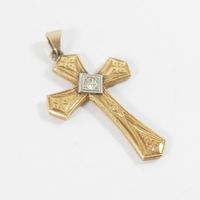 Croix en or 750 mil guilloché et platine 850 mil, centrée d'un diamant 8/8 (petit manque) (Dim hors bélière : 3,5 x 2,3 cm environ). 3,1 g brut.