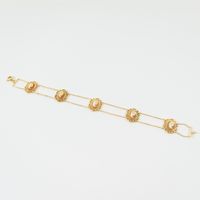 Bracelet en or 750 mil. composé d'un double rang de maillons forçat retenant 5 motifs filigranés sertis chacun d'un camée coquille figurant un profil féminin (longueur : 17,3 cm environ, largeur : 1,4 cm). 6,2 g. brut.