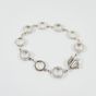Bracelet en or gris 750 mil. composé de maillons circulaires, certains diamantés (longueur : 18,5 cm, largeur : 1 cm environ), avec huit de sûreté. 12 g. brut.