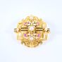 Broche en or 750 mil. ciselé et guilloché à décor de grecques et d'arabesques partiellement émaillées, sertie de demi- perles et de corindons roses. Travail français, époque Napoléon III. (Dimensions : 4,3 x 4 cm). (Email accidenté, manque de matière à un corindon). 15,3 g. brut.