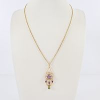 Collier en or 750 mil. à maillons jaseron avec fermoir en or 585 mil. (longueur : 41 cm) (soudures, accidents), accompagné d'un pendentif en or 375 mil. orné d'émail, d'améthystes et d'un péridot (dimension : 4,3 x 1,5 cm). 4,8 g. brut.