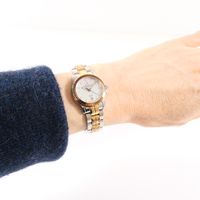 MICHEL HERBELIN "Newport Trophy". Bracelet-montre de dame en acier et PVD doré, boîtier rond (diamètre : 27 mm), cadran en nacre à index luminescents, guichet dateur à 6H, mouvement à quartz, sur bracelet en acier et PVD doré à boucle déployante papillon signée (longueur : 15 cm) (usures).