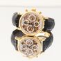 CHRONOSWISS, Opus. Montre chronographe squelette. Boîtier en or rose 750 millièmes. Numéroté C741S 5654. Cadran squelette ajouré à quatre sous-compteurs. Aiguilles Breguet bleuies. Mouvement mécanique à remontage automatique signée. Diamètre : 38 mm environ. Bracelet en cuir (*) avec boucle ardillon signée en or rose 750 millièmes. Poids brut : 104,04 g. Sans écrin ni papiers.