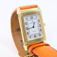 JAEGER-LECOULTRE, Reverso. Montre d’homme rectangulaire réversible. Référence 250.1.08. Boîtier en or jaune 750 millièmes signé et numéroté 1973397. Le dos aux initiales « TP ». Cadran argenté à chiffres arabes, aiguilles glaives bleuies. Mouvement quartz. Dimensions : 23 × 38 mm environ. Bracelet en cuir (*) avec boucle déployante en or jaune 750 millièmes signée. Taille : 16,5 cm environ. Poids brut : 59,94 g. Sans écrin ni papiers.