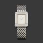 POIRAY, Ma Première. Montre de femme de forme rectangulaire. Boîtier en acier godronné signé et numéroté A30475. Cadran argenté strié. Mouvement quartz. Dimensions : 23 × 26 mm environ. Bracelet en acier avec boucle déployante signée. Taille : 14,6 cm environ. Sans écrin ni papiers.