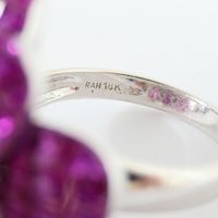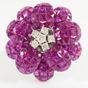 RAH Bague en or gris 750 millièmes figurant une fleur, le centre orné de diamants ronds de taille brillant, les pétales entièrement sertis de rubis ou pierres rouges calibrées. Signée. (Égrisures) Tour de doigt : 55,5 Poids brut : 14,5 g