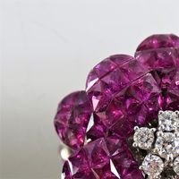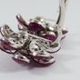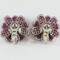 RAH Paire de boucles d’oreilles en or gris 750 millièmes, chacune figurant une fleur, le centre orné de diamants ronds de taille brillant, les pétales entièrement sertis de rubis ou pierres rouges calibrées. (Égrisures et manque deux pierres) Système pour oreilles percées. Signée. Hauteur : 2,5 cm Poids brut : 26,9 g