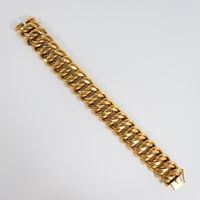 Bracelet en or 750 mil. à maille gourmette américaine, travail français (longueur : 20 cm environ) (largeur : 21,3 mm environ) (petits chocs). 49,7 g.