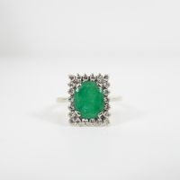 Bague en or gris 750 mil. ornée au centre d'une émeraude dans un entourage de diamants taille brillant. TDD : 57 1/2. Poids brut : 5,8 g.