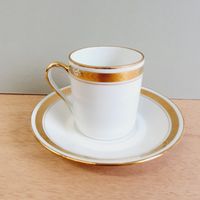 PORCELAINE DE SOLOGNE, LARCHEVEQUE : Service à café de 21 pièces en porcelaine blanche à décor doré de frises de feuilles de laurier, comprenant 9 tasses et 12 soucoupes. Marque sous la base. Haut : 6 cm ; diam. soucoupe : 12,7 cm.