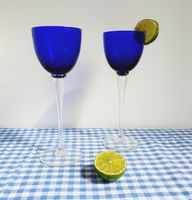 SAINT-LOUIS, modèle AMADEUS : 2 verres à pied en cristal Roemer bleu foncé et incolore. Cachet sous la base et étiquette. Hauteur : 24 cm. Avec sa boîte d'origine.