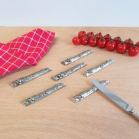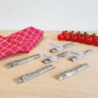 Suite de 6 porte-couteaux en métal argenté pouvant former porte-noms, à décor naturaliste de tronc d'arbre. Non signés. Longueur : 11 cm.