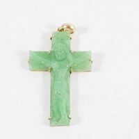 2 pendentifs ornés d'un jade gravé sur une monture en or 585 mil : dont 1 bouddha (Dim : 2,8 x 2,5 cm environ) et 1 croix (Dim : 4,5 x 2,8 cm environ). 16,7 g brut.
