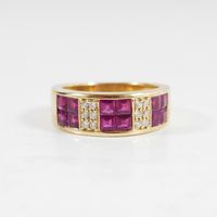 Bague bandeau en or 750 mil ornée de 3 pavages de rubis en serti invisible intercalés de 2 motifs diamantés (TDD : 52; Larg 0,7 cm environ). 6,1 g brut.