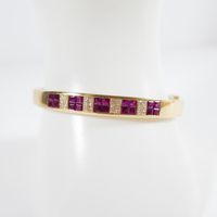 Bracelet rigide ouvrant en or 750 mil centré de 5 pavages de rubis en serti invisible intercalés de 4 motifs diamantés (Diam intérieur : 5,8 x 5 cm; Larg : 0,7 cm environ). 23,2 g brut.