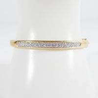 Bracelet rigide ouvrant en or 750 mil, la partie supérieur agrémenté d'un motif diamanté (Diam intérieur : 5,8 cm x 5 cm; Larg : 0,5 cm environ). 14,4 g brut.