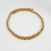 Collier en or 750 mil à mailles byzantine en chute (Diam : de 0,6 à 0,9 cm environ; Long : 45 cm) (petits chocs). 31,8 g.