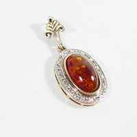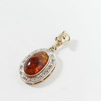 Pendentif ovale en or 375 mil centré d'un cabochon d'ambre entouré de diamants (Dim sans bélière : 2,2 x 1,7 cm environ). 4,8 g brut.