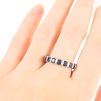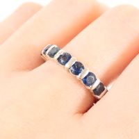 Alliance américaine en or gris 750 mil. Sertie de 16 saphirs (très égrisés). (TDD: 55) (rhodiage à prévoir). 6,4 g. brut.