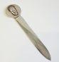 CHRISTOFLE, XXème siècle : Coupe-papier en métal argenté, la prise ronde à décor d'un masque africain, le dos marqué IBRU dans un poisson stylisé. Signé, poinçon de la maison pour 1935-1983. Longueur : 22 cm.