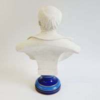 SEVRES et Albert-Ernest CARRIER-BELLEUSE (d'après) (1824-1887) "Portrait du Président Jules GREVY" Buste en biscuit sur piedouche émaillé bleu et filet or. Signé Carrier Belleuse au dos et gravé J. Grévy dans un cartouche sur le devant. Manufacture nationale de Sèvres, marque rouge RF datée 1886, marque bleue S. 85 sous le piedouche. Hauteur : 42,5 cm. (Salissures)