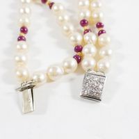 Bracelet de 2 rangs de perles de culture (Diam : 8 mm environ) rehaussées de perles de rubis et de rondelles rainurées en or 750 mil, fermoir en or gris 750 mil rehaussé de diamants (Long : 21 cm). 36,1 g brut.