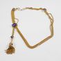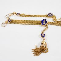 Chaîne de montre en or 750 mil de 3 rangs (1 maillon colonne et 2 corde torsadé) rehaussée de 4 motifs émaillés ornés de perles de culture retenant un pompon au même motif (Long : 48 cm; Larg des 3 brins : 0,7 cm environ). 36 g brut.