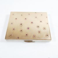Poudrier en or 750 mil et argent 800 mil à décor de fleurs centrées d'un cabochon de pierres rouges (Dim : 8,2 x 10 x 1,2 cm environ), fermoir rehaussé d'une ligne de pierre rouges. 210,4 g brut.