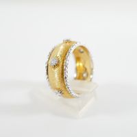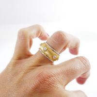Attribuée à DJULA. Bague bandeau 2 ors 750 mil., décor guilloché à effet satiné et ciselé, ponctuée de 6 diamants taille brillant, poinçon de la Maison (TDD : 56) (largeur : 9,3 mm environ). 6,2 g. brut