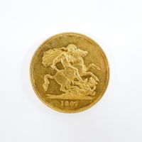 Souverain de 5 pounds en or 916 mil. (buste couronné de Victoria - 1887) (usures). 39,6 g.