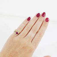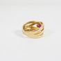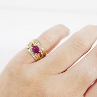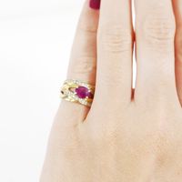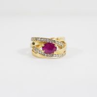 Bague bandeau ajouré 2 ors 750 mil. à motifs de croisillons sertie d'un rubis ovale, et de diamants taille 8/8 (TDD : 47,5, largeur : 1 cm). 5,7 g. brut.