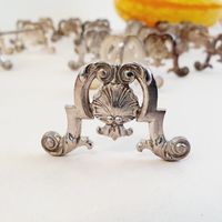 ROUX-MARQUIAND, LYON, début XXe siècle : Suite de 12 porte-couteaux en métal argenté modèle coquille et enroulements feuillagés. Poinçon de maître RM à l'étoile. Longueur : 8 cm.