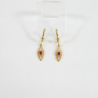Paire de pendants d'oreilles en or 750 mil retenant un maillon olive filigrané centré d'une pierre rouge (Haut : 2,8 cm; Larg : 0,6 cm). 1,8 g brut.
