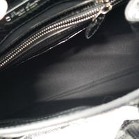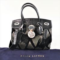 RALPH LAUREN made in Italy. Sac "Ricky" 33 cm en python et daim noir, perles métallisées. Double poignées, fermetures languettes sur rabat, anse bandoulière amovible, clefs sous clochette, fermeture cadenas typique du "Ricky". Ht 28 x Larg.32 x Prof.14cm environ. Bon état, quelques usures aux coins. Dustbag, carte Ralph Lauren numérotée, étiquette Ralph Lauren. Ce sac a été baptisé "Ricky" en hommage à la femme et muse de Ralph Lauren.