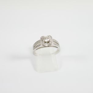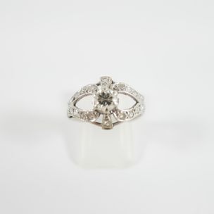 300 / 400 €Bague : ajourée en or gris 750 mil. centrée d'un diamant taille brillant de 0,40 ct environ épaulé de diamant taille 8/8 (TDD : 55) (déformations). 4,4 g. brut.