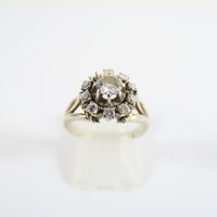 Bague fleur : en or gris 750 mil. et platine 950 mil. centrée d'un diamant demi-taille de 0,40 carat environ dans un entourage de diamants taille 16/16, travail français (TDD : 53,5) (diamètre : 11,2 mm environ) (manque un diamant, accident et manque à la monture, éclats). 5,8 g. brut